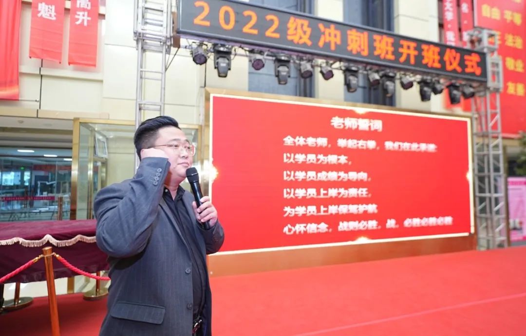 紧接着,全体教师身着整齐工装,身姿挺拔,在领誓人的带领下,举起右手,庄严宣誓。 ![]() ![]() “以学员为根本,以学员成绩为导向,以学员上岸为责任,为学员上岸保驾护航,心怀信念,战则必胜,战,必胜必胜必胜。” 誓言铮铮,回荡在校园上空。每一位老师脸上都写满了坚定,他们深知,这不仅是一份承诺,更是日复一日的坚守。从精心备课到耐心辅导,从课堂解惑到生活关怀,他们将用爱与责任,为学生们保驾护航,助力梦想腾飞。 ![]() ![]() ![]() ![]() ![]() ![]() 随后,学生代表上台发言,她慷慨激昂的话语点燃了同学们“决胜考场,舍我其谁”的雄心壮志。她表示,作为学生要明确目标,脚踏实地,不畏风雨,勇毅前行,以汗水浇灌,用智慧耕耘,夺取考试的胜利。 宣誓环节将仪式推向了高潮。在领誓人的带领下,全体参会学生庄严宣誓,誓言响彻云霄,表达了他们决战升学考试的坚定决心和信心。